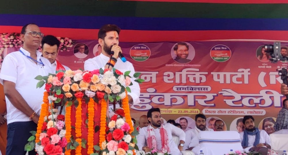 Sep232024Union Food Processing Minister Chirag Paswan addre… newsjw3m Photo Caption Union Food Processing Minister Chirag Paswan addresses a rally ahead of the Jharkhand state Legislative Assembly election in the Latehar district of Jharkhand on Monday, September 23, 2024.